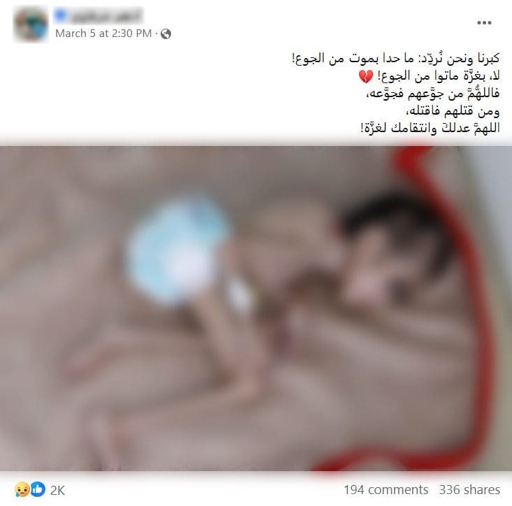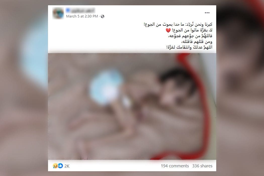 نقلًا عن الأمم المتحدة -دون تصرف-: “جدد مسؤولو الأمم المتحدة التحذير من الخطر الوشيك بحدوث مجاعة في غزة. وقال كريستيان ليندماير المتحدث باسم منظمة الصحة العالمية إن البيانات الرسمية تفيد بأن طفلا عاشرا- مسجلا بأحد المستشفيات- مات تضورا من الجوع.” في هذا السياق تداول ناشطون على فيسبوك صورة يدعي ناشروها أنها تظهر أحد الأطفال من غزة إثر هذا الحصار المفروض على غزة،