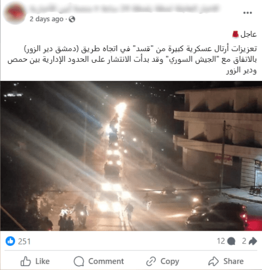 هذه الصورة متداولة منذ عام 2022 على الأقل لدخول هيئة تحرير الشام إلى عفرين، ولا توثق انتشار قوات سوريا الديمقراطية على الحدود الإدارية بين محافظة حمص ودير الزور