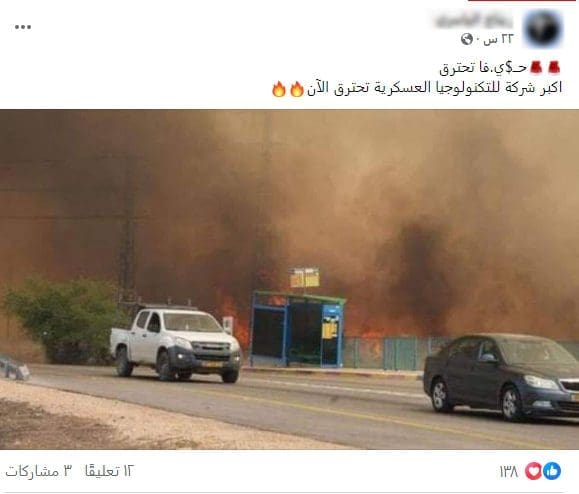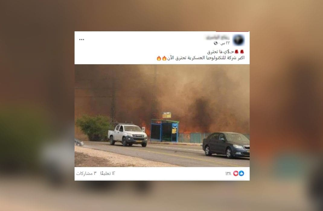 إثر ذلك تداول ناشطون على الفيسبوك صورةً يدعون أنها تعود لحريق إحدى شركات التكنولوجية العسكرية في مدينة حيفا مؤخرًا،