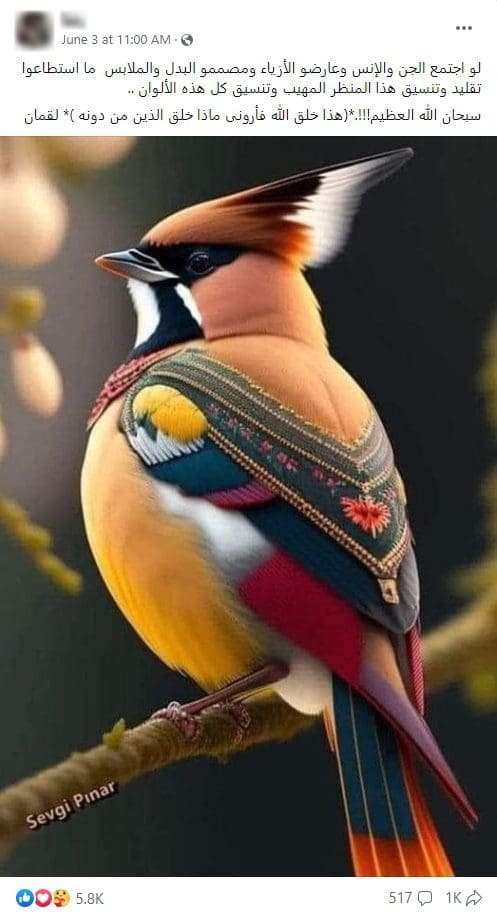 تناقل ناشطون على الفيسبوك صورة يدّعي ناشروها أنها تُظهر طائرًا بألوان وزخارف حقيقية.