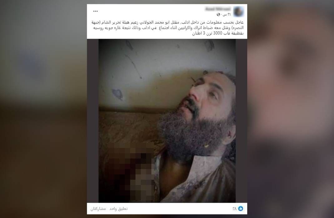 إثر ذلك تداول ناشطون على الفيسبوك صورة يدعون أنها تظهر مقتل زعيم هيئة تحرير الشامأبو محمد الجولاني” جراء هذا القصف،