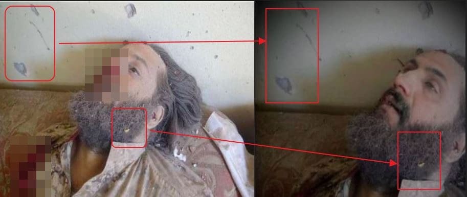 بينما عمد مروجو الادعاء إلى التعديل على هذه الصورة لتغيير بعض تفاصيل الصورة والألوان للادعاء بأنها تظهر مقتل أبو محمد الجولاني.