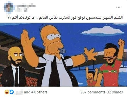 تناقل بعض الناشطين على موقع التواصل الاجتماعي فيسبوك صورة يزعمون من خلالها أن مسلسل سيمبسون الشهير قد تنبأ بفوز منتخب المغرب بكأس العالم 2022.