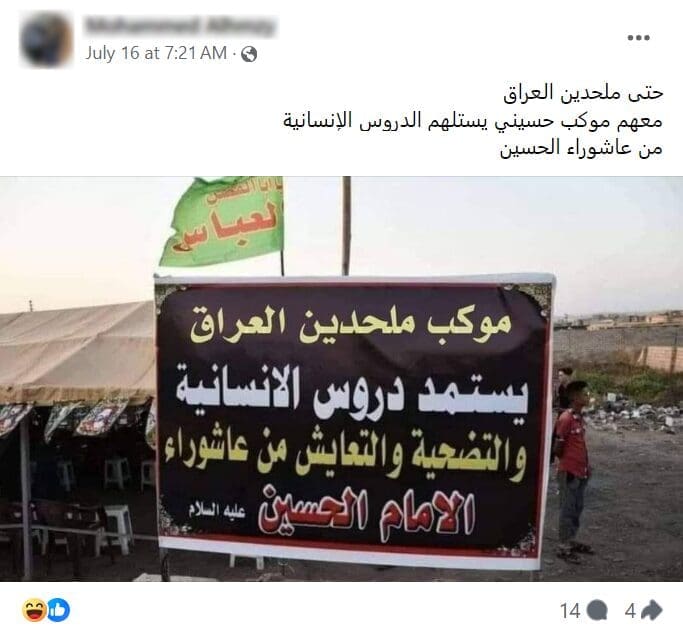 هذه الصورة مفبركة والأصلية تعود للموكب الحسيني في زمار، ولا تصور لافتة كتب عليها “موكب ملحدين العراق”
