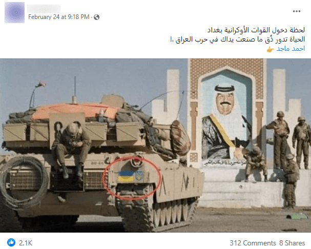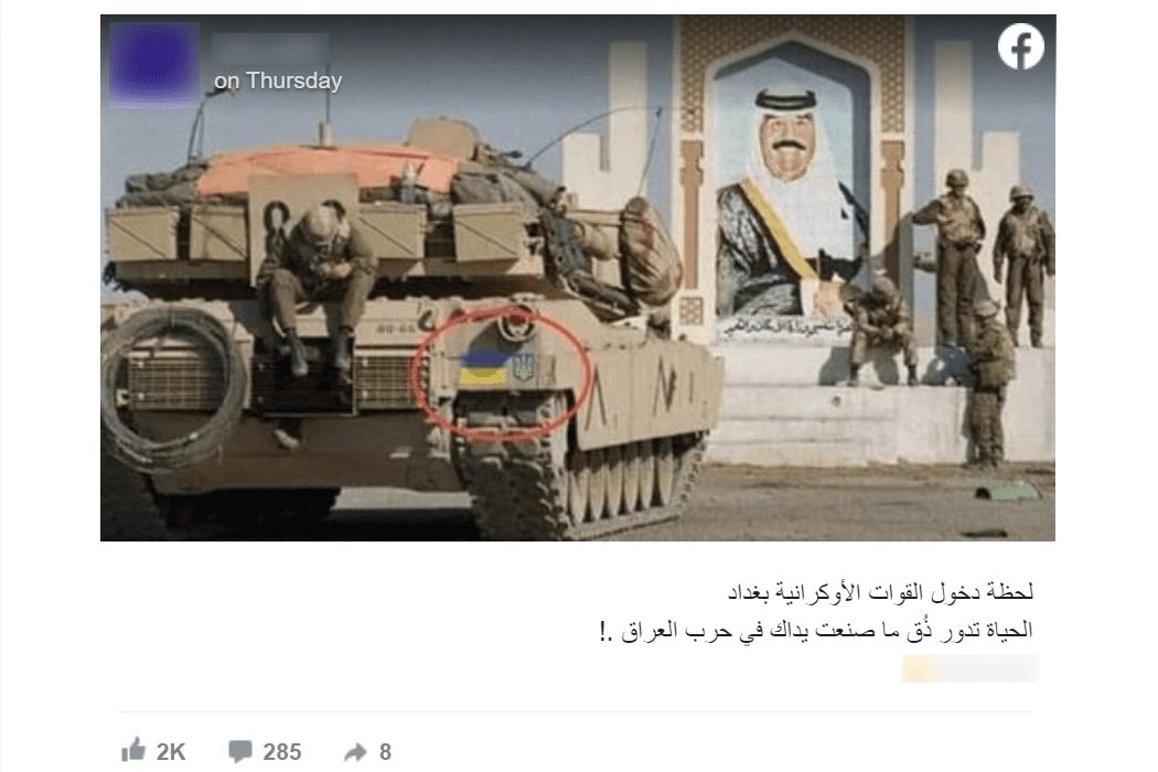 إثر ذلك، تداول ناشطون على مواقع التواصل الاجتماعي صورة يزعمون أنها تظهر دبابة أوكرانية في العراق عام 2003،
