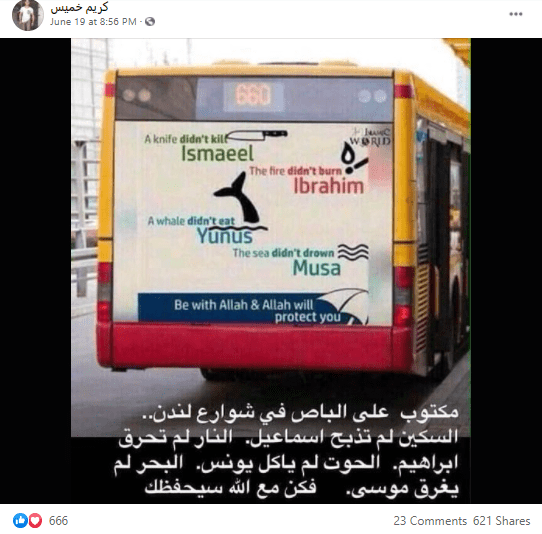 انتشرت على موقع التواصل الاجتماعي فيسبوك صورة يزعم ناشروها أنها تعود إلى حافلة في مدينة لندن عاصمة المملكة المتحدة،
