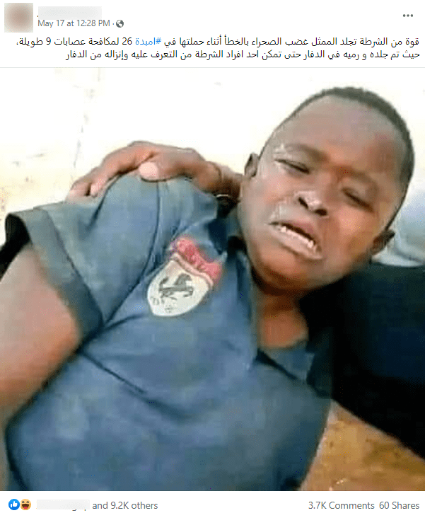انتشرت على مواقع التواصل الاجتماعي صورة يزعم ناشروها أنها تظهر الممثل “غضب الصحراء” بعد أن تم الاعتداء عليه من قبل القوات الأمنية،