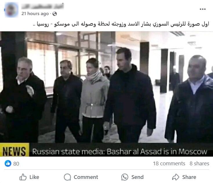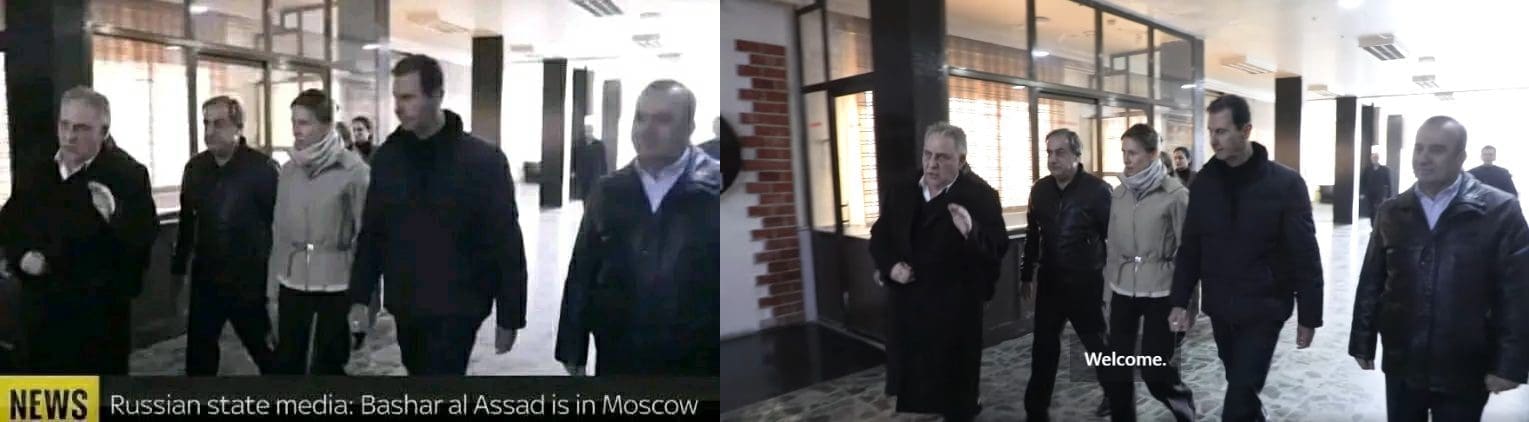 بحسب فرانس24: «ذكرت وكالات أنباء روسية الأحد نقلا عن مصدر في الكرملين أن الرئيس السوري بشار الأسد وعائلته وصلوا إلى موسكو وحصلوا على حق اللجوء من السلطات الروسية. ونقلت وكالة إنترفاكس للأنباء عن المصدر الذي لم تذكر اسمه قوله “وصل الرئيس السوري الأسد إلى موسكو. ومنحته روسيا (هو وعائلته) حق اللجوء لأسباب إنسانية”.» إثر ذلك تداول ناشطون على الفيسبوك صورةً يدعون أنها تظهر لحظة وصول بشار الأسد وزوجته إلى موسكو،