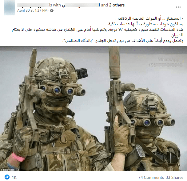 انتشرت على مواقع التواصل الاجتماعي صورة يزعم ناشروها أنها تظهر جنودًا من القوات الخاصة الروسية “السبيتناز”، يتملكون خوذات عسكرية متطورة.