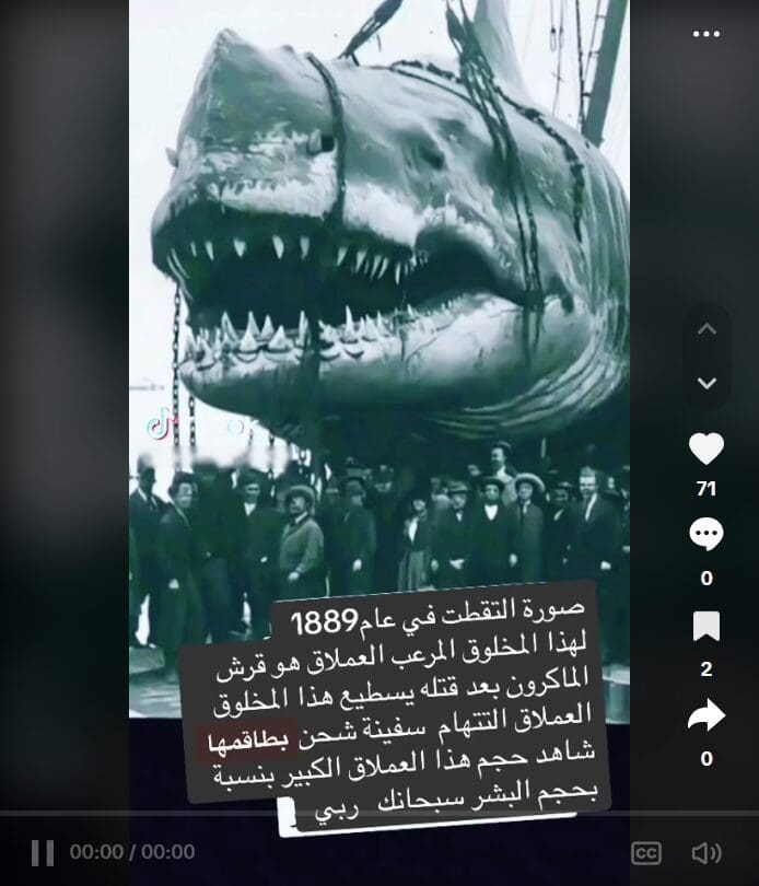 فيما أرفق في وصف هذه الصورة قصة خيالية حول العثور على قرش «الميجالودون» حيًا، وهو نوع من أسماك القرش المنقرضة منذ ملايين السنين،