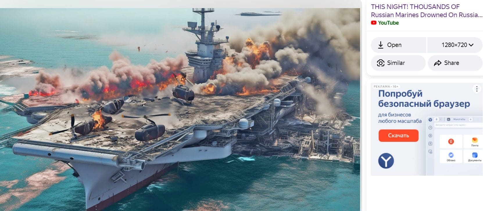 قاد البحث العكسي عن الصورة على Yandex إلى يوتيوب، حيث نشرت إحدى قنوات المنصة صورة مماثلة كغلاف لمقطعٍ نشرته لمشاهد استهداف حاملة صواريخ من لعبة المحاكاة العسكرية Arma 3.