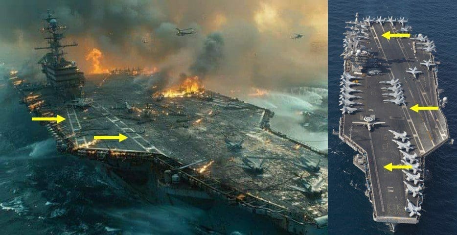 فيما تظهر الصورة التالية مقارنة بين سطح حاملة الطائرات إيزنهاور CVN 69 (يمين) مع صورة الادعاء في اليسار، ويمكن ملاحظة الاختلاف بين ممرات تدريج الطائرات بين الصورتين، والخطوط المخصصة لاصطفاف الطائرات.