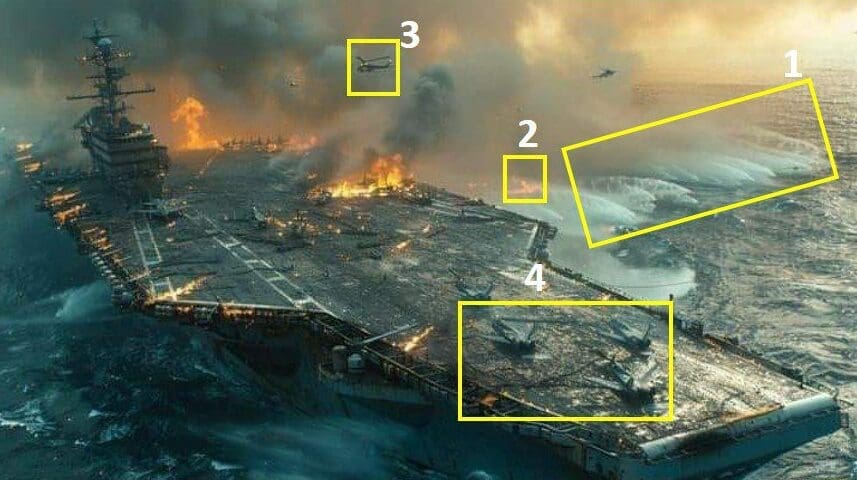 مما يبيّن أن الصورة مولّدة بواسطة إحدى تقنيات الذكاء الاصطناعي وليست صورة حقيقية لحاملة الطائرة إيزنهاور.