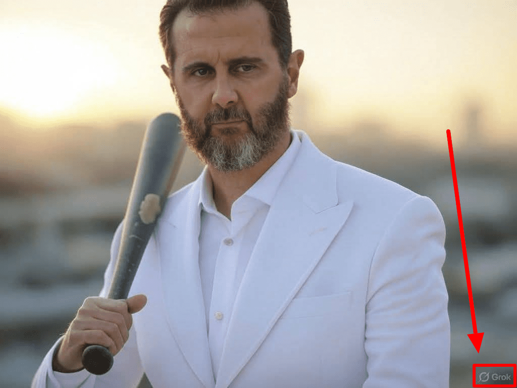 وتُظهر الصورة الكاملة بشار الأسد وهو يحمل مضرب بيسبول على كتفه، إلى جانب شعار “Grok” للذكاء الاصطناعي في زاوية الصورة.