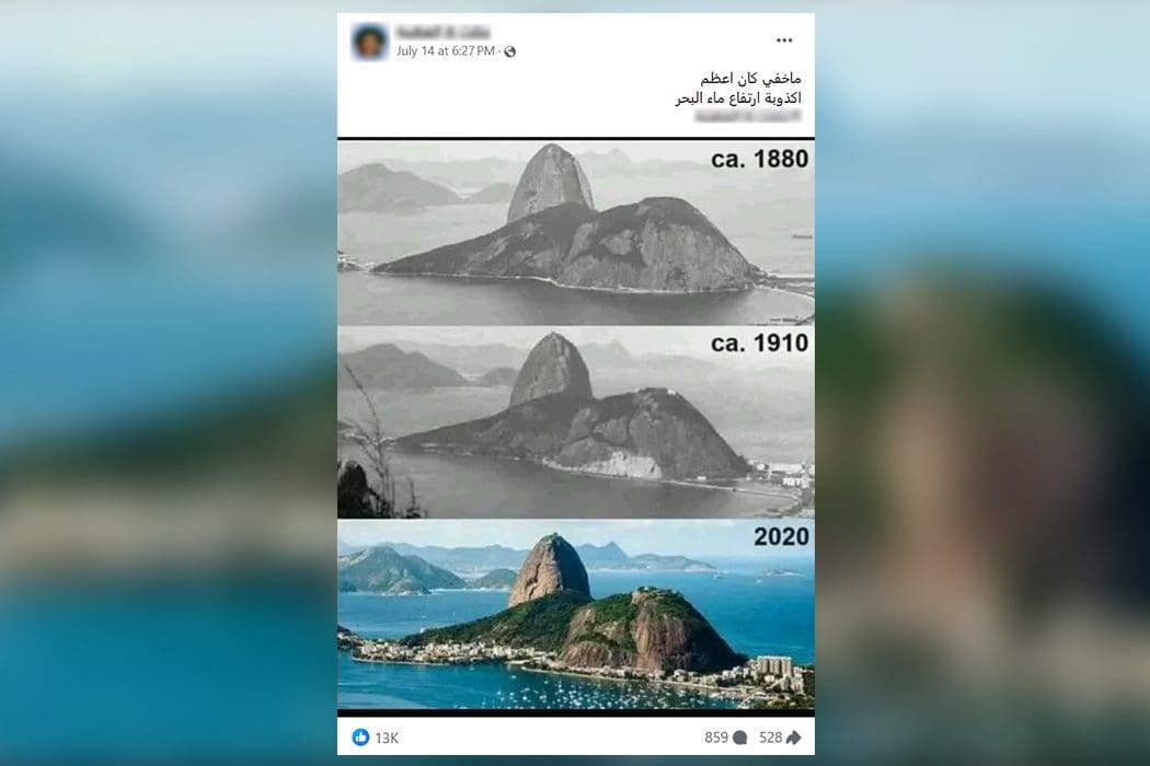 تداول ناشطون على فيسبوك صورًا متعددة من سنوات مختلفة لجبل شوجرلوف في ريو دي جانيرو يُزعم أن مستويات سطح البحر عنده ظلت مستقرة لمدة 140 عامًا، وهذا ينفي –بحسب الادعاء– ارتفاع مستوى سطح البحر.