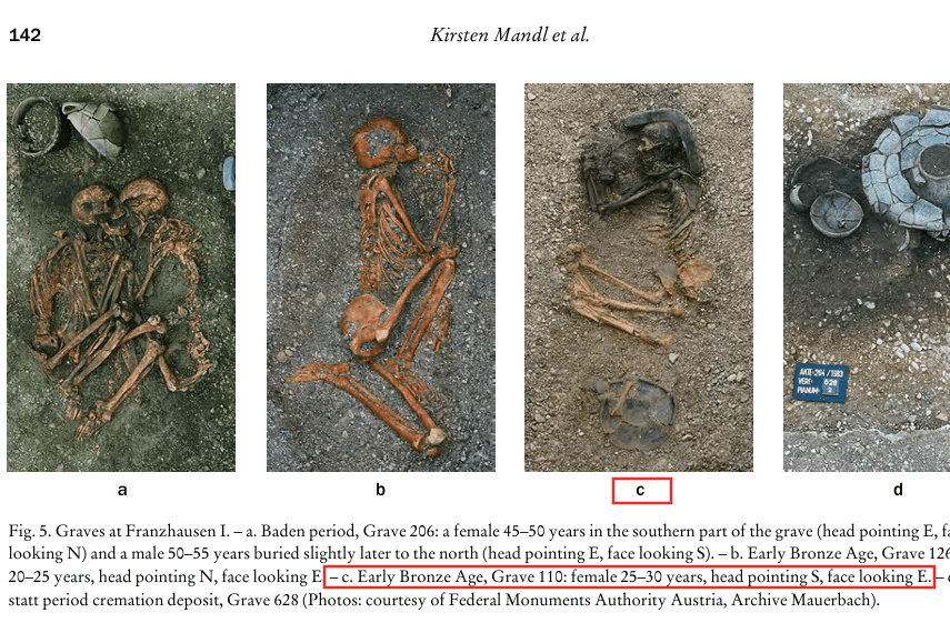 وبعد الاطلاع على محتوى البحث، تبيّن أنه يحتوي على صورة أخرى للهيكل ذاته، تُؤكد اكتشاف قبر امرأة في مدفن فرانزاوزن – المقبرة الأولى في فترة العصر البرونزي المبكر. إذ أشار الوصف المرفق بالصورة إلى أنها تعود لاكتشاف قبر رقم 110، الذي احتوى على جثة امرأة يتراوح عمرها بين 25 و30 عامًا، وكان رأسها موجهًا نحو الجنوب.