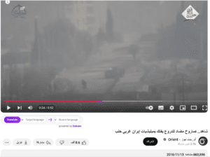 حيث نشرته قناة أورينت نيوز في 13 نوفمبر 2016، مرفقًا بالوصف التالي -دون تصرف-: بث المكتب الإعلامي لـ”جيش المجاهدين” المنضوي ضمن غرفة عمليات “فتح حلب” تسجيلاً مصوراً يُظهر لحظة استهداف الثوار لمجموعة من ميليشيات النظام في “ضاحية الأسد” غربي مدينة حلب