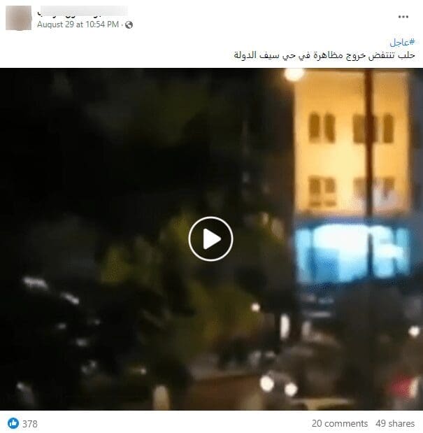 فيما لم يتسن لفريق فتبينوا التحقق من السياق الأصلي لمشاهد الادعاء إلا أن تداولها منذ عام 2011 ينفي أن تكون لمظاهرات حديثة في حلب.