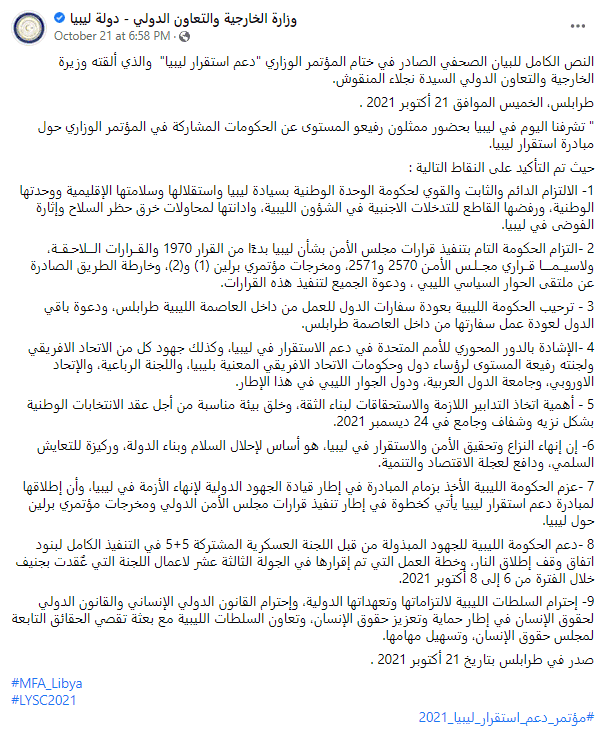 وعقد يوم الخميس 21 أكتوبر في العاصمة طرابلس مؤتمر دعم استقرار ليبيا وشارك فيه ممثلون عن عدد من الدول،