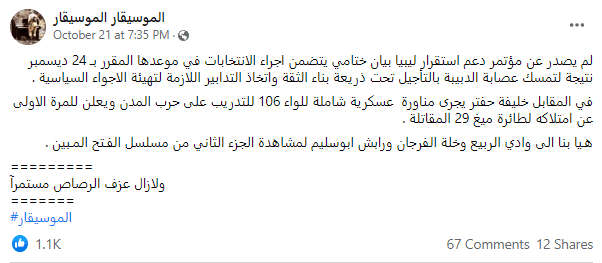 وأكد البيان الختامي على أهمية اتخاذ التدابير اللازمة لاستحقاقات بناء الثقة، وخلق بيئة مناسبة من أجل إجراء الانتخابات الوطنية بشكل نزيه وشفاف وجامع في موعدها 24 ديسمبر القادم،