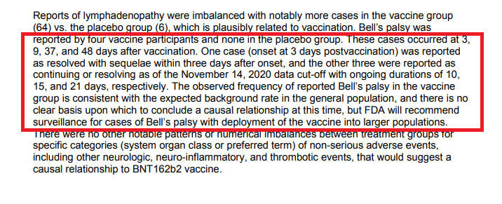 وفي الصفحة رقم 38 تذكر أنه تم الإبلاغ عن 4 حالات شلل بالوجه في المجموعة التي تلقت اللقاح ولم تظهر أي حالة في المجموعة التي تلقت اللقاح الوهمي.