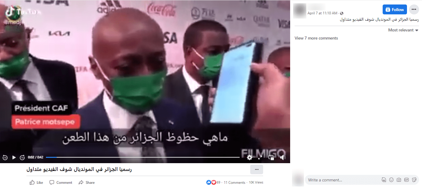 إثر ذلك، يتداول ناشطون على مواقع التواصل الاجتماعي مقطعًا يظهر رئيس الاتحاد الأفريقي لكرة القدم “كاف” يُعلن فيه قبول الطعن المقدم من الجزائر،