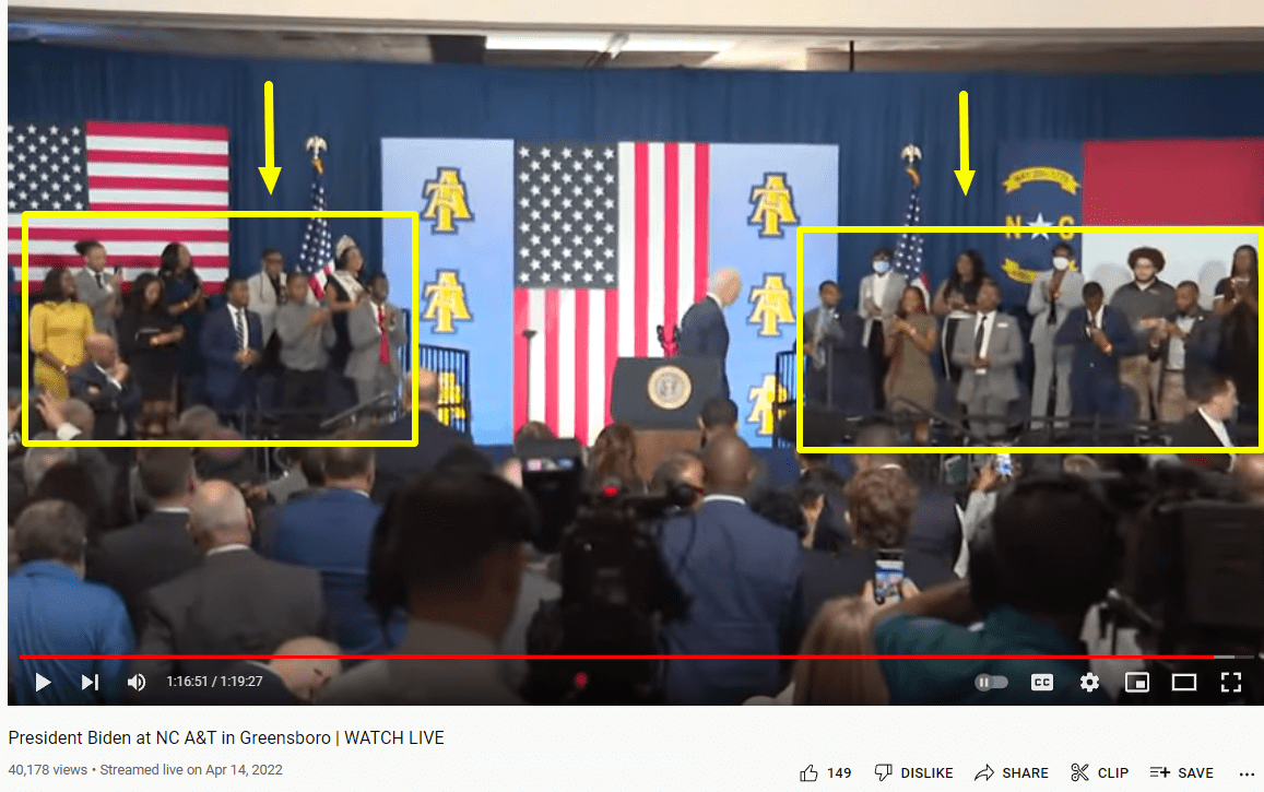 فيما ظهر المقطع الكامل للخطاب أن الجمهور كان يجلس على الجانبين الأيمن والأيسر خلف الرئيس الأمريكي،