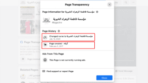نُشر الادعاء بتاريخ 14 يوليو 2020 ، نلاحظ أيضًا أنه وبتاريخ 13 يوليو 2020، أي قبل تاريخ المسابقة بـ24 ساعة فقط، عُدّل اسم الصفحة من “أزياء” إلى “مؤسسة فاطمة الزهراء الخيرية”. ممّا يؤكّد أنّ الصّفحة مزيّفة.
