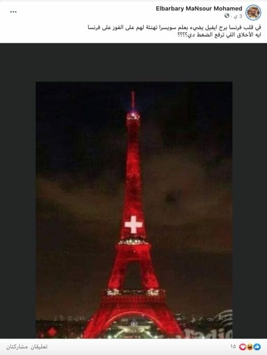 تناقل الصورة العديد من رواد منصة الفايسبوك، وأرفقت بتعليقات تفيد أن برج إيفل أضيء بألوان علم سويسرا ،
