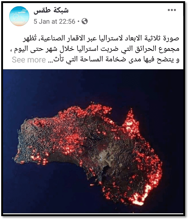 ليست صورة من الفضاء،بل محاكاة ثلاثية الأبعاد من عمل anthony hearsey حسب بيانات نشرتها ناسا تظهر فيها الأماكن التي تأثرت بالحرائق من تاريخ 2019/12/05 حتى 2020/01/05 الصورة مبالغ فيها بسبب الوهج وليست كل الأماكن مشتعلة الآن.