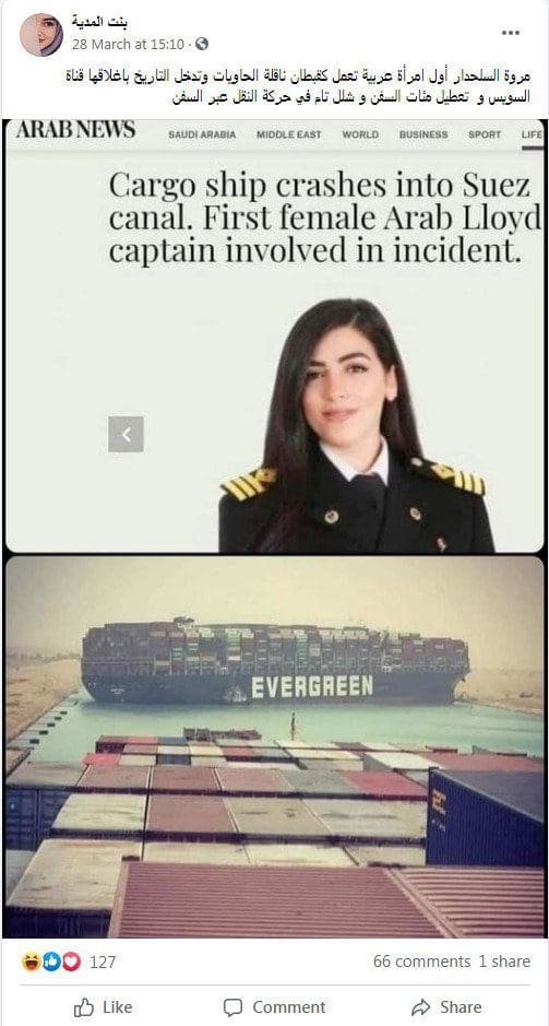 انتشر على موقع التواصل الاجتماعي فيسبوك ادعاء مفاده أن الكابتن قبطان مروة السلحدار هي التي كانت تقود السفينة الجانحة في قناة السويس.