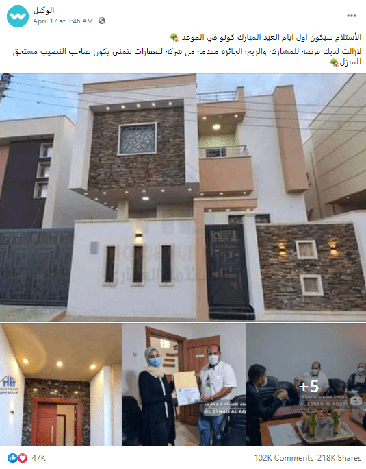 - جلب عدد متابعات واشتراكات أكبر للصفحات الناشرة لهذه المسابقات الكاذبة من خلال منشورات مضللة يتم إضفاء الطابع الإنساني أو الموسمي أو التضامني بغرض التمويه والتضليل،