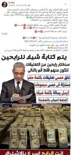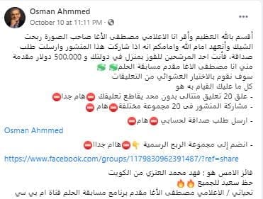 انتشر على موقع التواصل الاجتماعي فيسبوك مسابقة بفرصة الربح 500 ألف دولار مقدمة من مقدم برنامج الحلم مصطفى الآغا