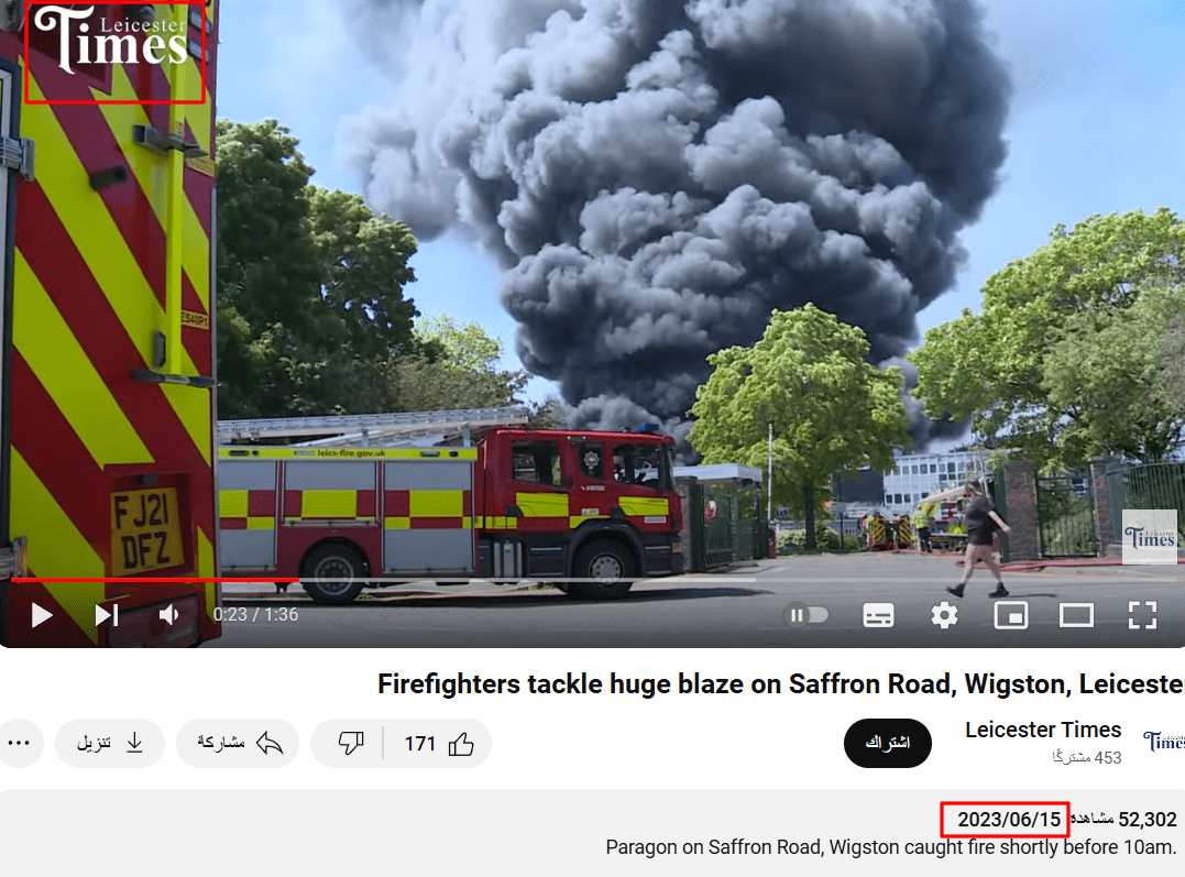 إذ كشف البحث العكسي عن إحدى لقطات المقطع عن أنه قديم، ومنشور في 15 يونيو 2023 عبر قناة “ليستر تايمز” – الظاهر شعارها أعلى يسار فيديو الادعاء.