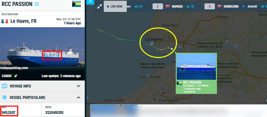 لقطة شاشة في 24 نوفمبر تبيّن أن سفينة glovis passion موجودة في مرفأ لو هافر الفرنسي