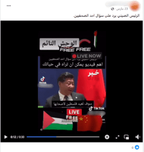 تناقل ناشطون على مواقع التواصل مقطعًا يدعون أنه يظهر الرئيس الصيني يجيب عن سؤال أحد الصحفيين في مؤتمر صحفي بأنه سوف يسعى لتحرير فلسطين في حال أصبحت الصين القوة العظمى الوحيدة في العالم.