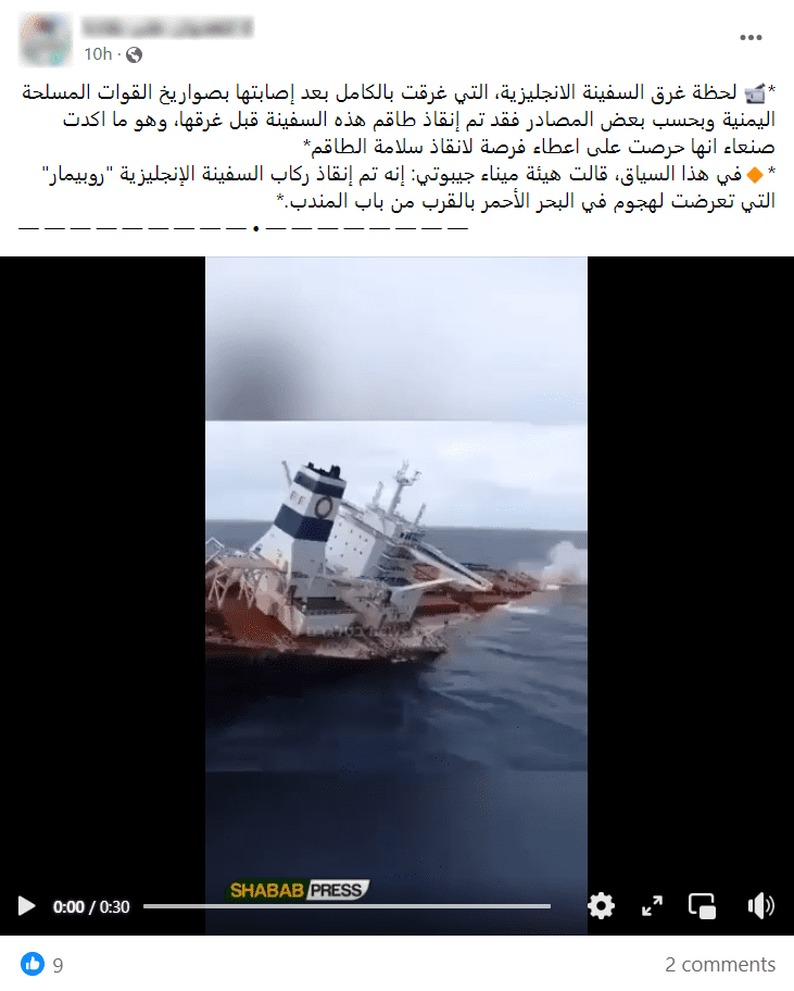 نقلاً عن فرانس24 -دون تصرف-: “قالت جماعة الحوثي اليمنية الإثنين إنها استهدفت سفينة شحن بريطانية في خليج عدن بصواريخ بحرية، بعدما أفادت شركة “أمبري” للأمن البحري ليلا عن تعرض سفينة مسجلة في بريطانيا لهجوم بالمنطقة. كما قال الحوثيون إنهم أسقطوا طائرة أمريكية بدون طيار في مدينة الحديدة بغرب البلاد.” إثر ذلك تداول ناشطون على الفيسبوك مقطع فيديو يدعون أنه يظهر لحظة غرق السفينة “روبيمار”،