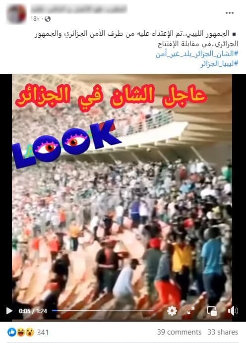 وقاد بحث بالكلمات المفتاحية: «مدرجات ملعب وهران» على منصة فيسبوك إلى المقطع ذاته منشورًا بتاريخ 24 سبتمبر 2022،