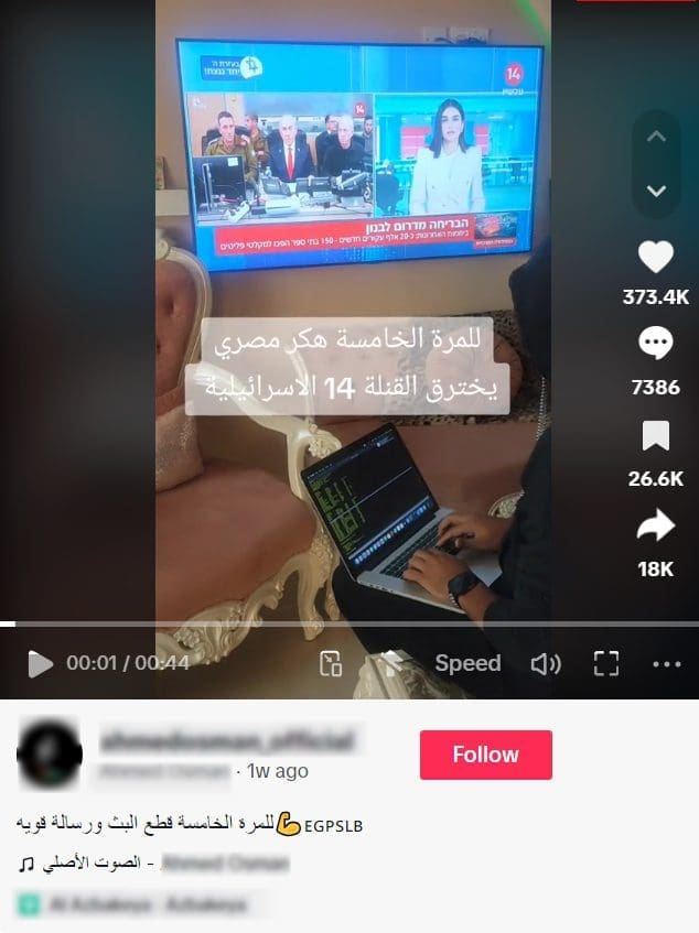 هذا المقطع مركب ومعدّل رقميًا، ولا يصوّر اختراق شاب مصري بث القناة 14 الإسرائيلية