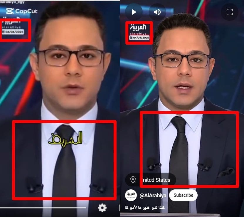 أرشد البحث العكسي عن لقطة ثابتة من مقطع الادعاء في محرك البحث جوجل إلى قناة العربية في منصة اليوتيوب، إذ نشرت مشاهد المقطع ذاتها بتاريخ 04 أبريل 2025، فيما كان المذيع يتحدث عن خبر مغاير لما ورد في الادعاء، ويحمل عنوانًا مفاده: «كندا تدير ظهرها لأميركا»، في إشارة بحسب الوصف إلى أن العلاقة مع الولايات المتحدة حسب وصف وزيرة خارجية كندا ميلاني جولي لن تعود كما كانت بعد رسوم ترمب.