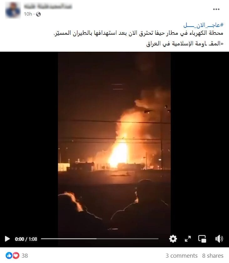 في هذا السياق تداول ناشطون على فيسبوك فيديو يدعون أنه يظهر حريقًا في محطة الكهرباء في مطار حيفا إثر استهدافه من قبل المقاومة الإسلامية في العراق،