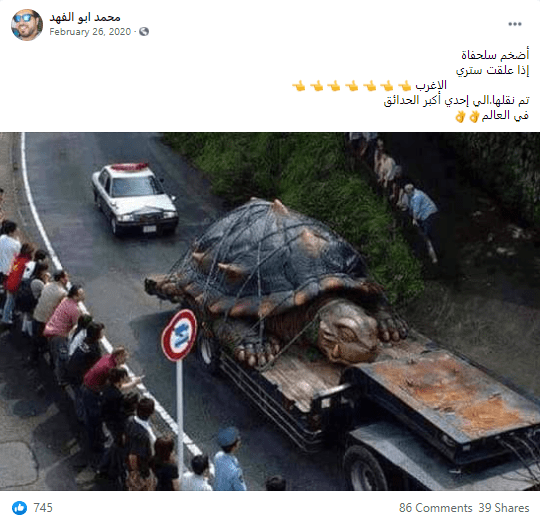 انتشرت على مواقع التواصل الاجتماعي فيسبوك وتويتر صورة سلحفاة يزعم ناشروها أنها تظهر اكبر سلحفاة بالعالم،
