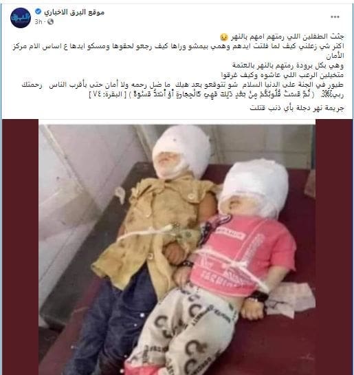 انتشرت على مواقع التواصل الاجتماعي صورة لجثتي طفلين ادعى ناشروها بأنها تعود للطفلين اللذين غرقا بعد أن ألقت بهما أمهما في نهر دجلة في العراق