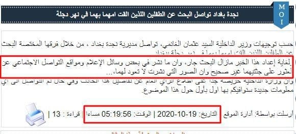 كما نشر موقع وزارة الداخلية العراقية خبرًا عند الساعة 07:11:24 مساء يوم الإثنين 2020/10/19 عن العثور على الفتاة، والبحث جارٍ عن شقيقها، ونشرت وزارة الداخلية صورة لجثة الطفلة، وتختلف الصورة عن تلك المنتشرة في مواقع التواصل، ونفت ما يُتداول عبر وسائل التواصل الاجتماعي حول العثور على جثتي الطفلين.