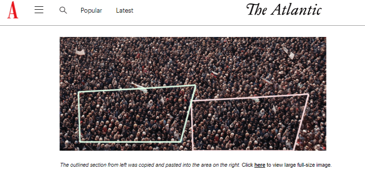 وأرفق موقع theatlantic الملاحظة التالية على الصورة: هذه الصورة معدلة، نسخ جزء من الحشد ولصقه في مكان آخر بالصورة