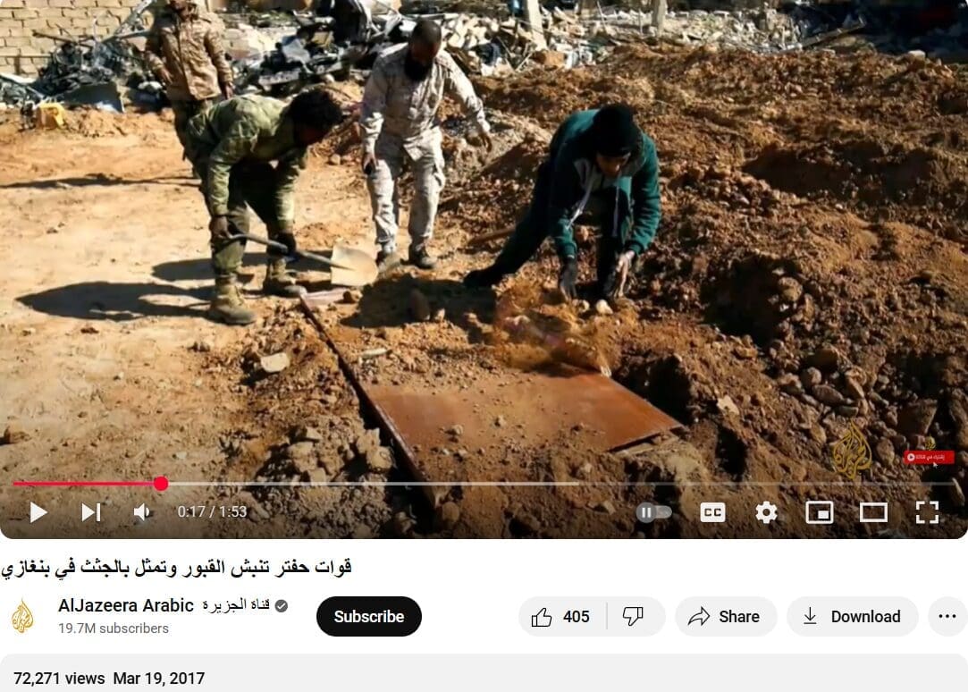 هذا ونشرت قناة الجزيرة الصورة ذاتها رفقة صورٍ أخرى ضمن تقريرٍ إخباري عبر قناتها في اليوتيوب بتاريخ 19 مارس 2017، وذلك في سياق فتح تحقيق بشأن نبش قوات خليفة حفتر قبور مقاتلي مجلس شورى بنغازي، وسط مطالبات بتقديم هذه القوات إلى المحاكمات.