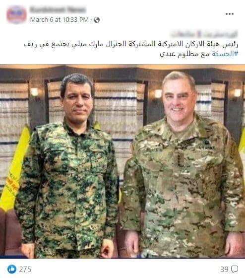 إثر ذلك تداول ناشطون على منصة الفيسبوك صورة يدّعون أنها تظهر اجتماع الجنرال مارك ميلي مع مظلوم عبدي في ريف الحسكة.