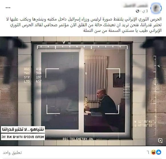 هذه الصورة مفبركة والأصلية متداولة منذ عام 2009، ولا تبين صورة التقطها الحرس الثوري الإيراني لنتنياهو من داخل مكتبه