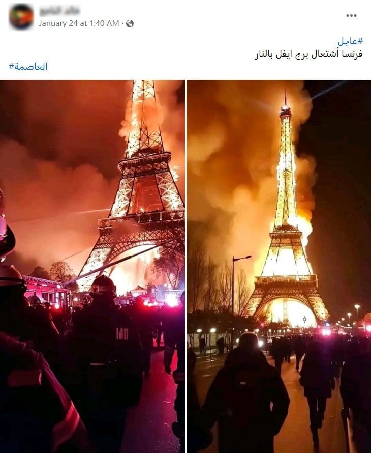 هذه الصورة مولدة باستخدام إحدى برامج الذكاء الصناعي، ولا تظهر اندلاع النيران في برج إيفل مؤخرًا