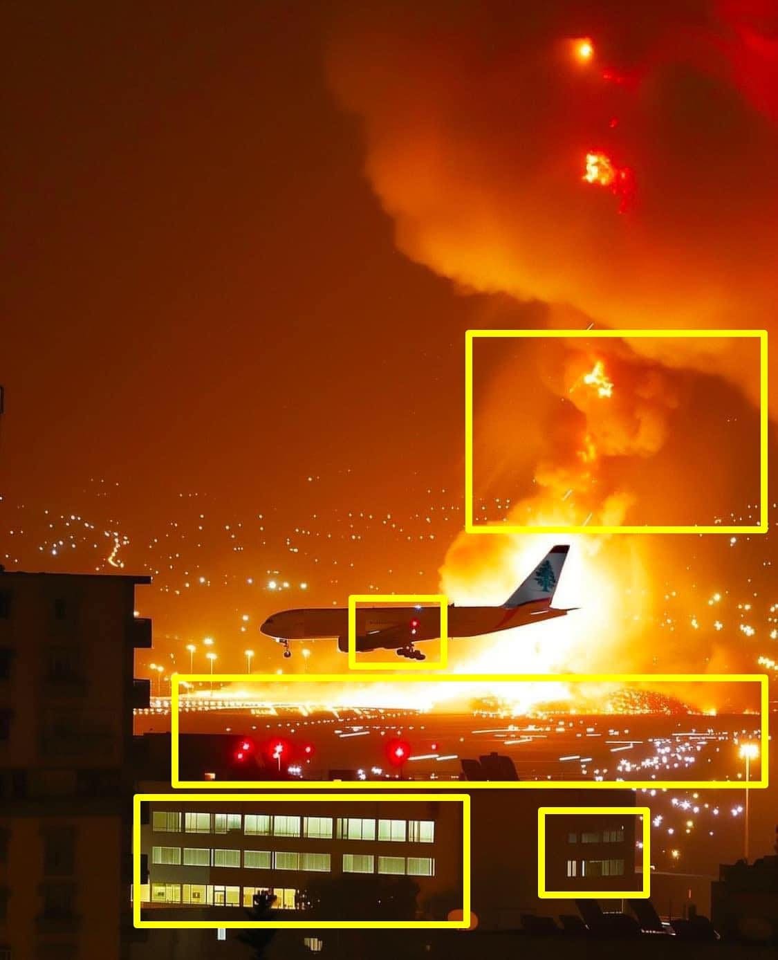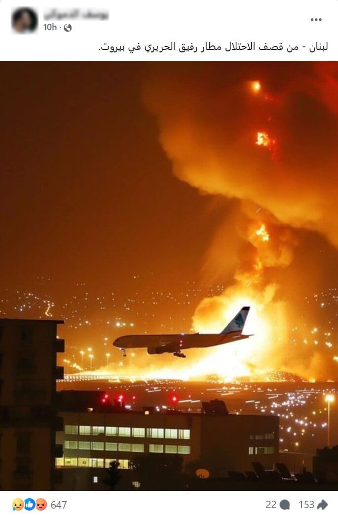 إثر ذلك تداول ناشطون على فيسبوك صورة يدعون أنها تُظهر مشهدًا لغارات على مطار رفيق الحريري في بيروت،